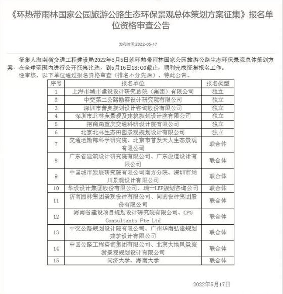 3682“共建国家生态文明试验区,海南省向全球征集生态环保景观总体策划”,6月16日,海南省交通工程建设局在海口市组织召开“环热带雨林国家公园旅游公路生态环保景观总体策划方案评选会”。北京北林生态田园景观规划有限公司作为独立单位参选,携精心准备的策划方案参与汇报,受到评委团的高度认可,获得了评审第4名的好成绩。